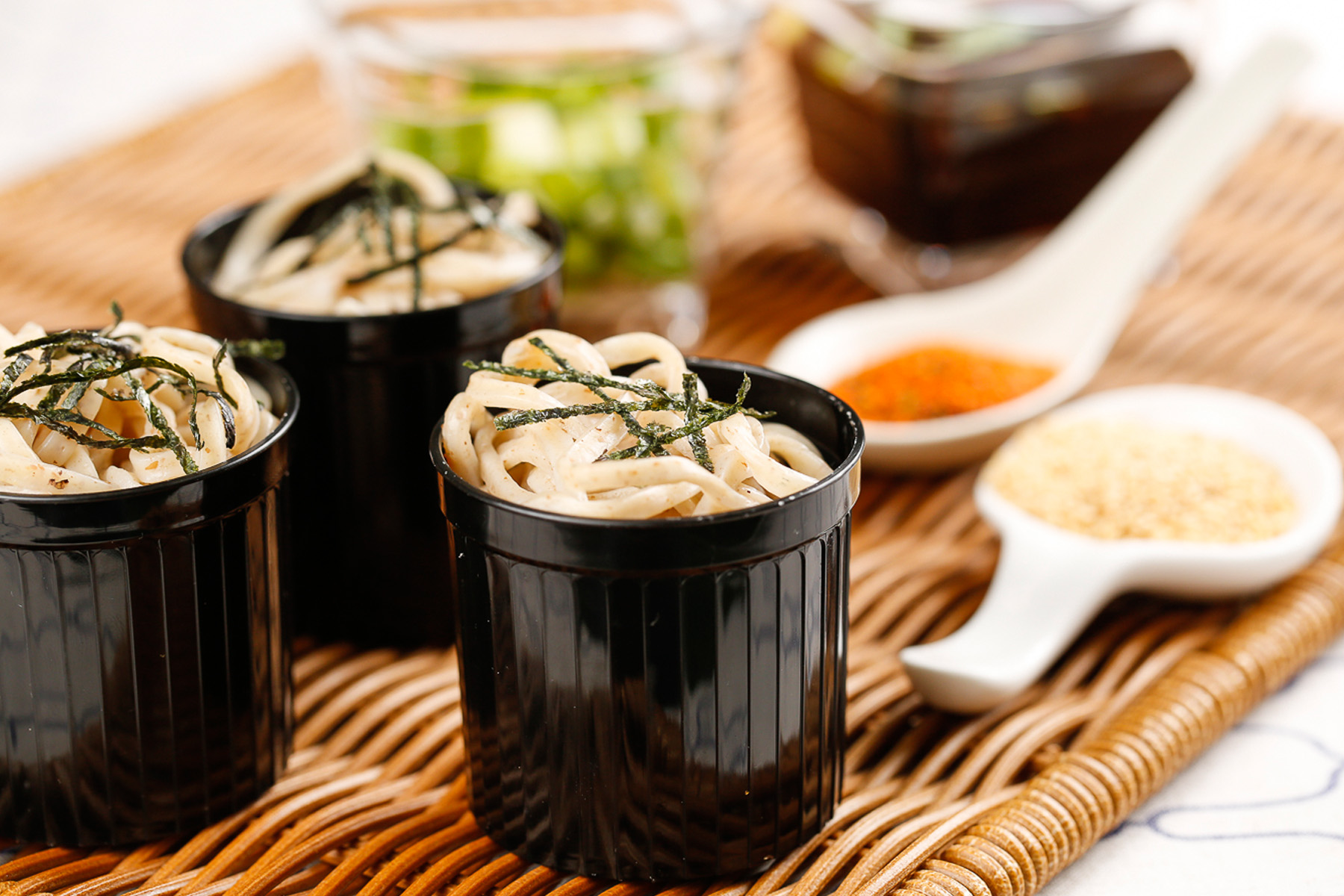 成分:蕎麥麵、配料(海苔絲、蔥花、七味粉、白芝麻)、特調沾醬(內含日式鰹魚醬油、味醂)。