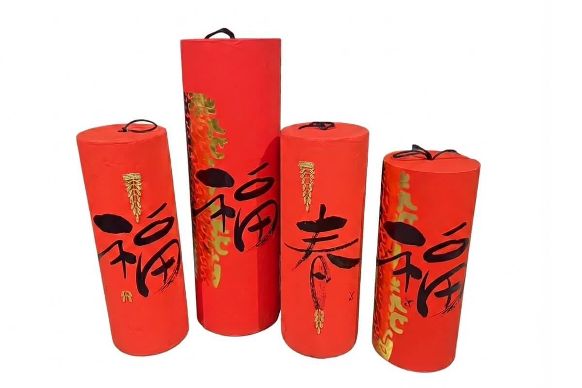 - 四個高度不一的鞭炮造型擺設,外層黏上春聯紙,其中三個寫福字、一個寫春字。