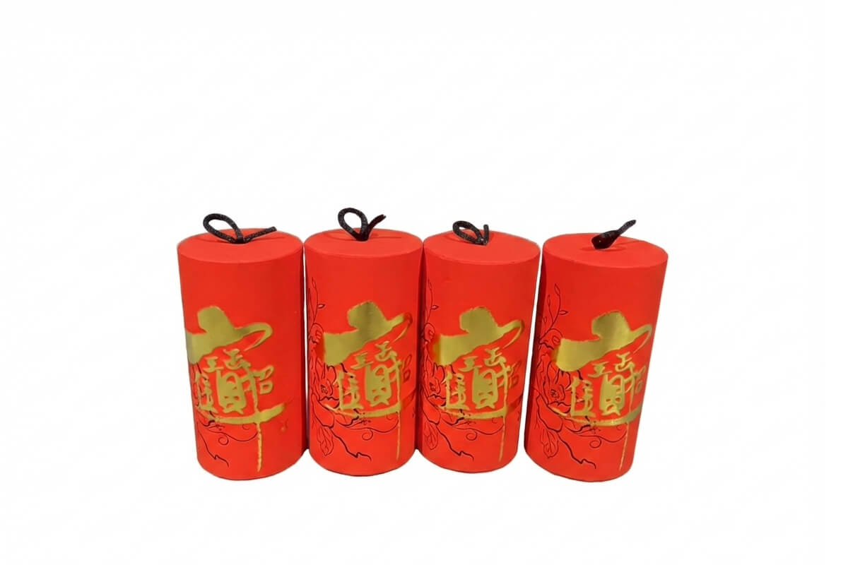 - 1組四個小鞭炮造型擺設,外層黏上春聯紙,寫上招財進寶