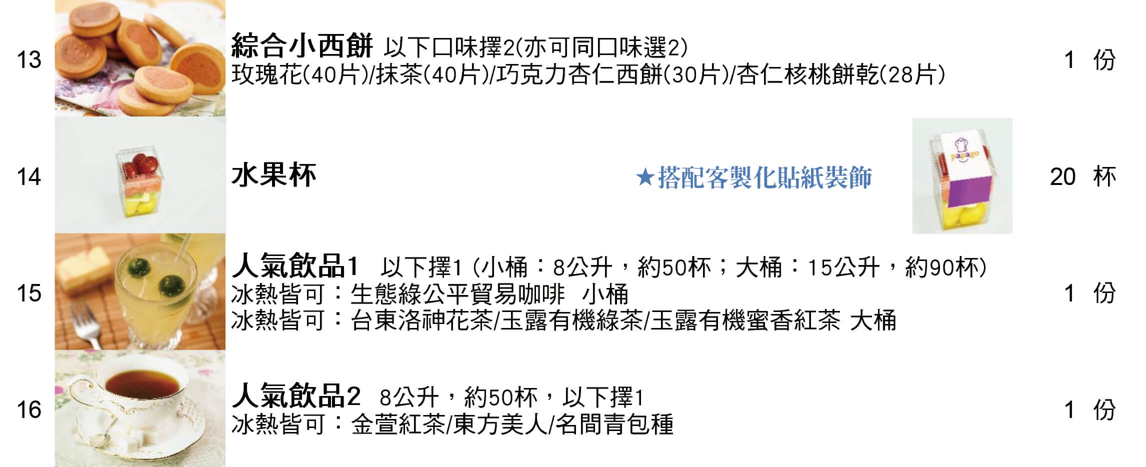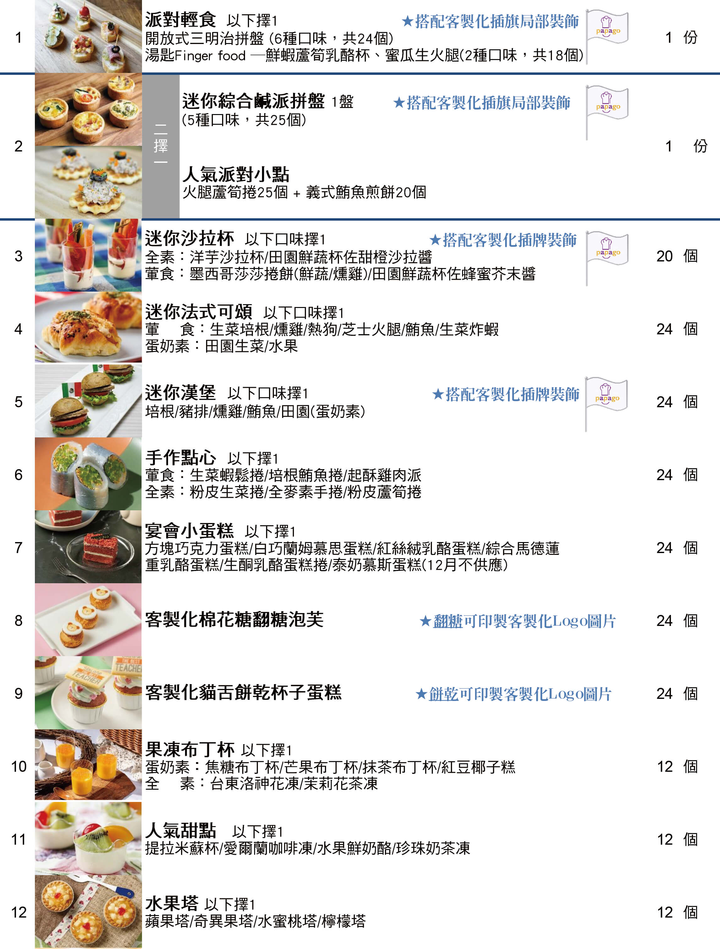 更安排多款客製化Logo食物列印餐點及客製化插旗,幫助品牌增加曝光度