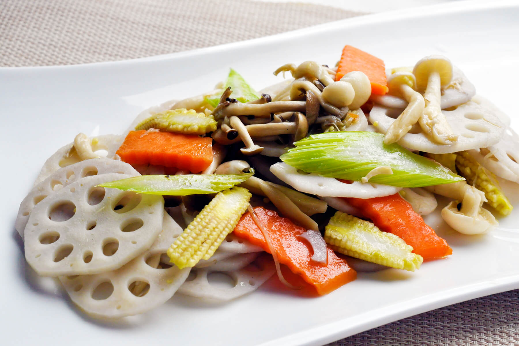 - 成分:蓮藕、玉米筍、紅蘿蔔、西芹、鴻喜菇、橄欖油、薑等
